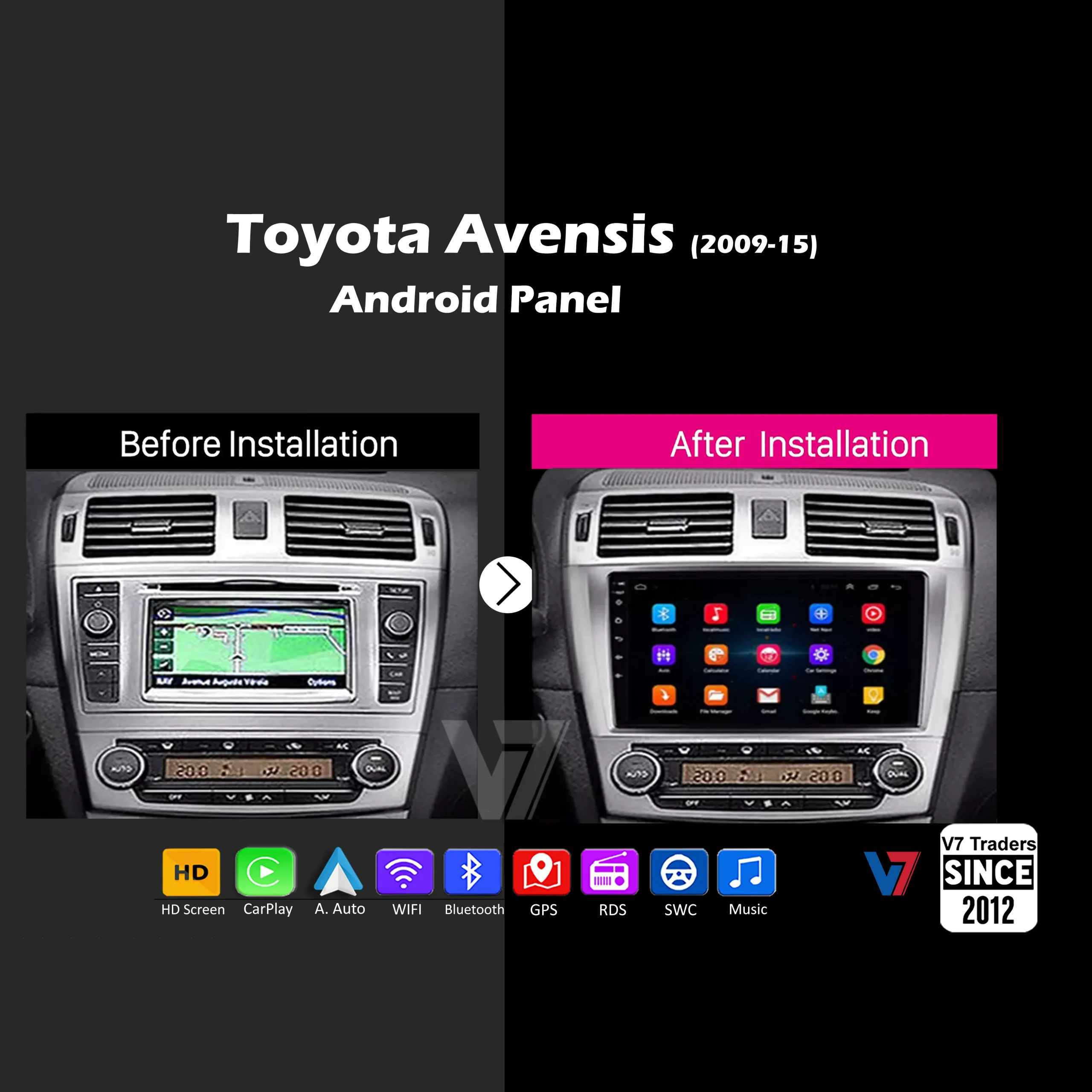 Toyota Avensis 2009-15 Android Navigation for models 2009, 2010,2011,2012, 2013, 2014 and 2015 Multimedia panel with big LCD Touch IPS Screen, features Bluetooth, Wi-Fi, offline GPS Maps and USB.