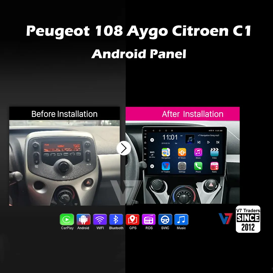 Transform your Toyota Aygo Citroen C1 Peugeot 108 2014-21 with high-quality 10.1 inch V7 Android Double Din Car Stereo with Wireless Apple CarPlay and Android Auto, Touch Screen Android Radio & Head unit. Our wireless double DIN units offer modern features, providing a fast and reliable solution for a more enjoyable and convenient driving experience. Experience safe, smart, and comprehensive control with Apple CarPlay and Android Auto. USB mirroring allows you to display and control your Android smartphone directly on the V7 Android screen. Enjoy optimal sound performance, and enhance safety with an optional rear-view camera for better visibility while backing up and monitoring your vehicle.